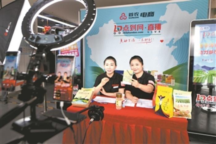 下图:7月28日,工作人员在扶贫超市内进行网络直播销售扶贫产品。