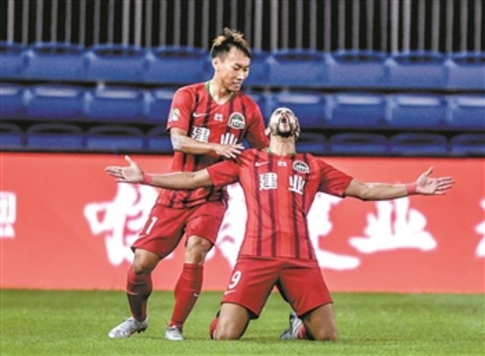 7月26日,河南建业队球员多拉多(右)进球后与队友柯钊庆祝。新华社记者 潘昱龙 摄