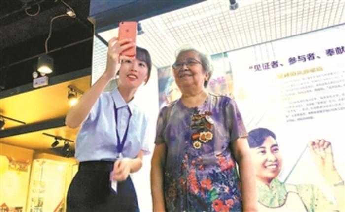 7月28日,上海,近90岁的全国劳模黄宝妹在展板前讲述往事。当日,“继往开来 领跑时代——东方国际集团劳模风采展”揭幕,再现了上海纺织工业百余位劳模的风采。