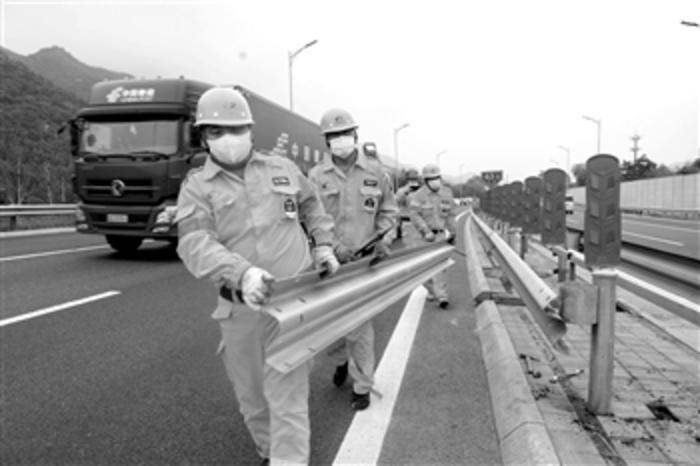 7月29日,在京藏高速出京方向43.5公里处,养护工人对道路设施进行修复。