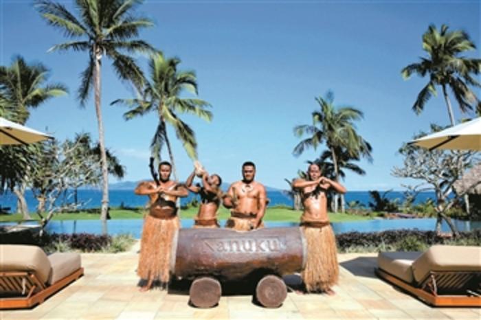 7月21日,在斐济首都苏瓦附近的纳努库奥博格海边度假村,身穿草裙的斐济“武士”为游客表演节目。目前,随着疫情得到一定程度缓解,斐济政府开始致力于重振日益萎缩的旅游业。新华社记者 张永兴 摄