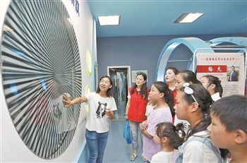 7月30日,巾帼志愿者和留守儿童在安徽省淮北市科技馆了解“大型莫尔条纹”。当日,淮北市相山经济开发区组织留守儿童到淮北市科技馆,参观各类科普项目展陈,参与科普游戏活动,乐享暑期。本报通讯员 万善朝 摄
