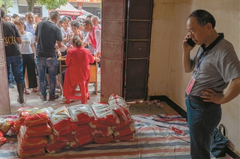 7月29日,安徽省六安市固镇镇,志愿者正在一处仓库前登记居民受灾情况,并为各家各户发放抗洪物资。