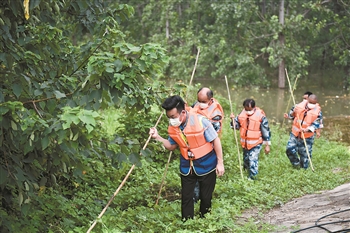 7月14日,长江无为大堤上,一支“劳模突击队”正在江堤上砍除杂草排查险情。