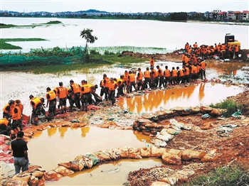 7月19日,位于安徽省合肥市肥西县的派河水位高涨,并出现倒灌城区现象。河水直逼派河边的一座商场,商场前积水严重。正在附近施工的中铁四局集团有限公司引江济淮工程(安徽段)江淮沟通段J002标项目经理部在接到肥西县政府通知后,紧急征调80余名员工以及6辆大型施工车,开展抢险加固。