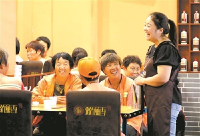 8月5日,王海燕(右一)和前来就餐的环卫工人聊天。