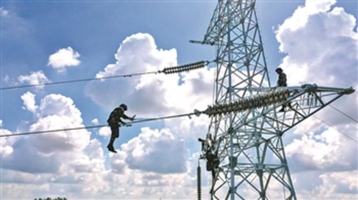 8月6日,几名送电工在吉林省长春市城郊的一处输电铁塔上施工作业。长春市连续多日出现高温天气,国网长春供电公司输电运检中心的送电工们不畏烈日“烤”验,坚守工作岗位。 新华社记者 张楠 摄