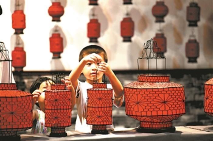8月10日,在河北省石家庄市桥西区冀台联文化产业园,小朋友在参观传统手工艺灯笼。