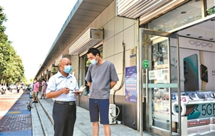 8月10日,亦庄镇贵园八号路商业街的物业公司员工和商户一起商量环境卫生管理工作。