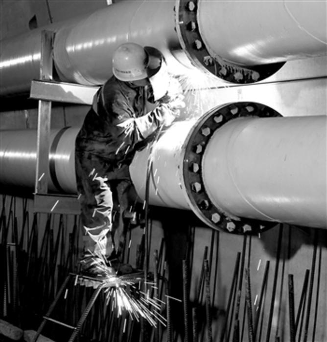 8月7日,山东济南黄河隧道施工现场,工人正在焊接加固泥浆管道。
