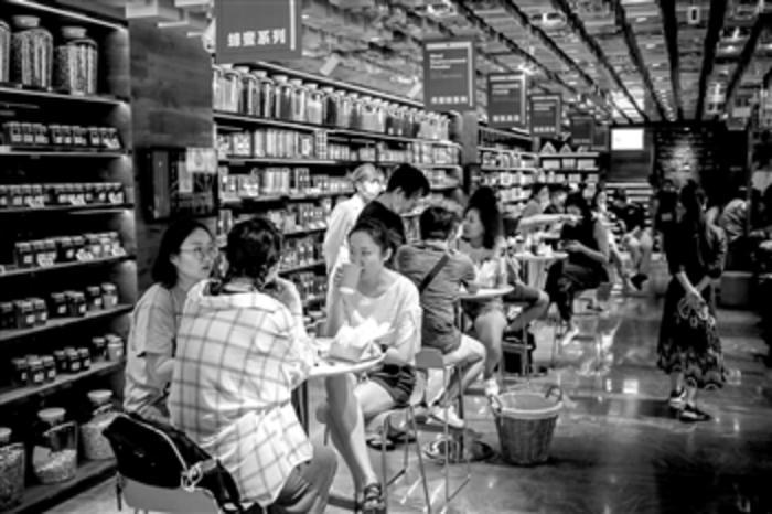8月9日,北京,在同仁堂知嘛健康线下店铺,顾客排起了长队,百年同仁堂转型新零售成为网红打卡地,很多咖啡产品也打起了养生牌,里面有枸杞、罗汉果等养生的配料。视觉中国 供图