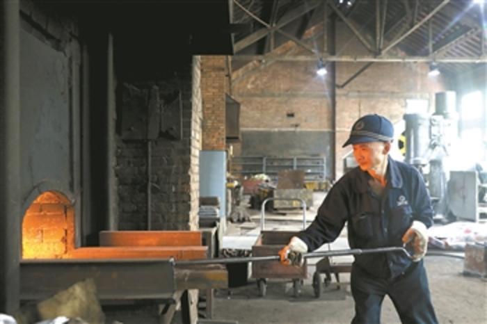 炎炎夏日里,室温高达50多摄氏度,陈忠宇早已浑身湿透。“打铁看似使蛮力,其实也是个技术活,煅烧的火候、手脚配合等等都影响锻打的质量和速度。”高大的空气锤旁,陈忠宇一次次低头弯腰,眼看手动脚踩不停锻打,还不时拿起成形的配件仔细检测。