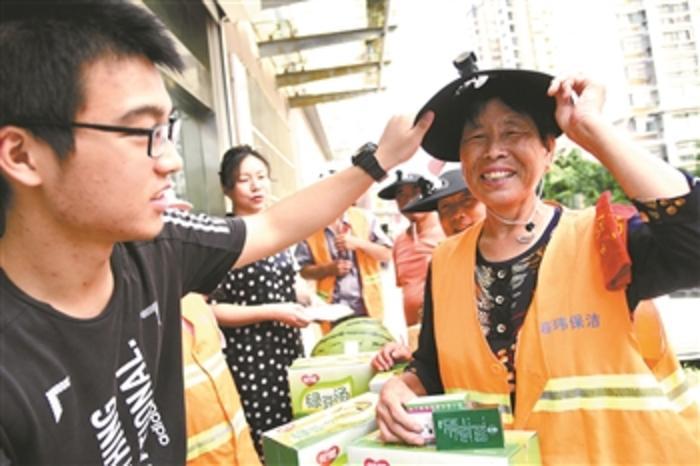 8月12日,在江苏省镇江市二道巷社区,环卫工人开心地戴上江苏大学志愿者赠送的风扇帽。