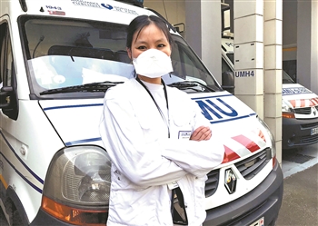 ①在法国巴黎抗疫一线工作的华人医生纳娜站在巴黎急救中心的救护车前。