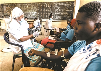 ③7月17日,志愿者在塞内加尔首都达喀尔参加无偿献血活动。