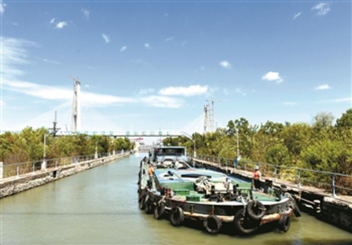 8月13日,货船有序通过安徽省巢湖一线船闸。