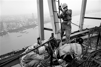 8月11日,工人在武汉绿地中心项目建设现场近500米的高空施工。