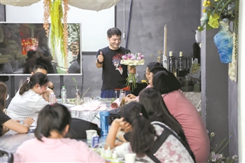 8月11日,在位于斗南花卉小镇内的西南花艺婚庆职业学校内,教师正在向学生讲述扎花技巧。