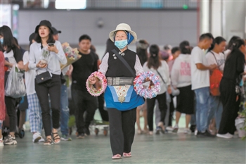 李涛是一名鲜花经销商,也是两个孩子的妈妈。每天吃过早饭,李涛便背着孩子来到花市,修剪花枝、打包出售。“创业妈妈不容易,但生意不能错过。”早晨这段时间,准备离开的游客会来赶早市,这样可以带走最新鲜的花。