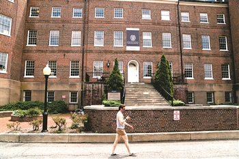 一名男子走在美国华盛顿的乔治敦大学校园内。