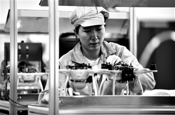 8月17日,工人在一飞智控(天津)科技有限公司车间内进行编队飞机组装工作。