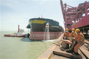 8月14日,一艘装载着15万吨加精矿粉的巨轮在宁波舟山港北仑矿石码头分公司减载后,带缆工人冒着高温拖拉缆绳进行解缆离泊作业。该公司有带缆工30余名,肩负着每年近3000艘次船舶的靠离泊任务。 蒋晓东 摄