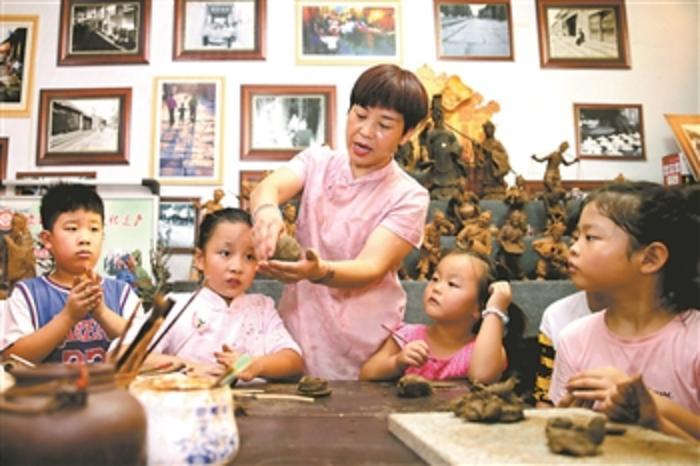 8月18日,非遗淮北泥塑传承人李绘娟指导小朋友制作泥塑作品。暑期,许多小朋友来到位于安徽淮北濉溪老街的安徽省级非遗淮北泥塑传承基地,了解淮北泥塑的文化历史,动手体验泥塑制作,感受非遗魅力。 万善朝 摄(新华社发)