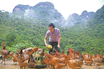 蓝国前家住琴棋村,他和爱人蓝月艳曾常年在外地建筑工地上务工。今年受疫情影响,他们不便外出务工,决定在家养鸡创业。目前,他们在村养殖基地养有活鸡3000只,还带动琴棋村近20户村民发展养鸡,蓝国前也被村民亲切地称为大山里的“鸡司令”。 新华社记者 周华 摄