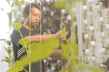 而这得益于酒泉市东洞镇开发的戈壁农业产业园区项目。近年来,东洞镇整合各类涉农资金,凝聚各方合作力量,持续加大基础设施项目资金投入力度,着重配套完善戈壁农业保鲜储藏库和加工项目。进一步加大引进培育新型经营主体的力度,强化引智技术培训和一二三产联动,培育新业态、新动能。项目吸引了很多在外打工的农民工返乡就业创业。图为马守全正在温室内查看黄瓜的长势。