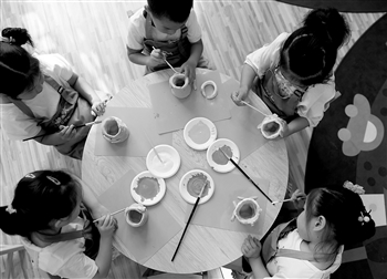 当日,浙江杭州富阳区新登镇第二幼儿园大山园区开展“五彩陶艺”暑期活动,幼师、党员志愿者指导小朋友进行陶艺创作。该校自2015年起开始将陶艺作为特色课程,锻炼学生的动手能力。 新华社记者 翁忻旸 摄