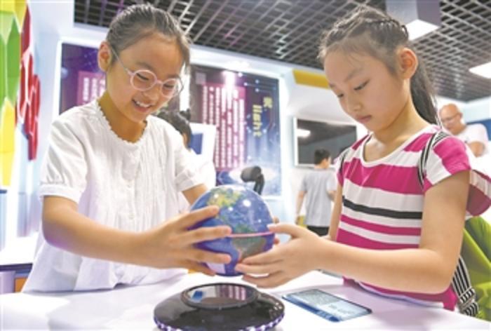8月22日,小朋友在派河社区科普馆内感受“悬浮球”。