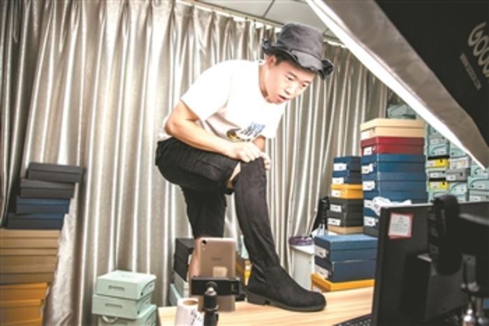 图为在四川阿么鞋业办公区,主播赵映财在直播推销一款女鞋(7月16日摄)。