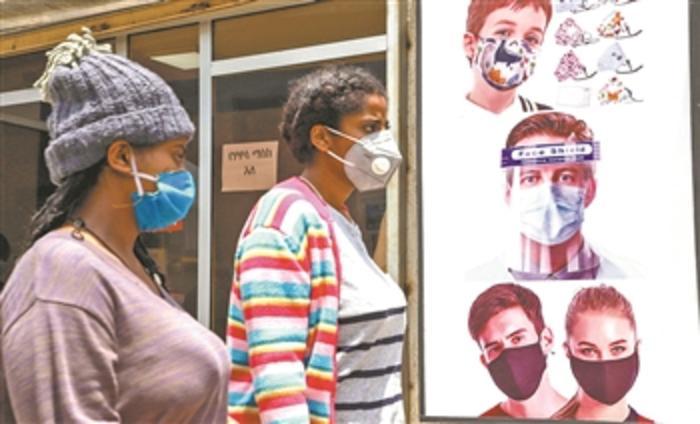 8月21日,行人在埃塞俄比亚首都亚的斯亚贝巴街头经过防疫宣传广告牌。新华社发(迈克尔·特韦尔德 摄)