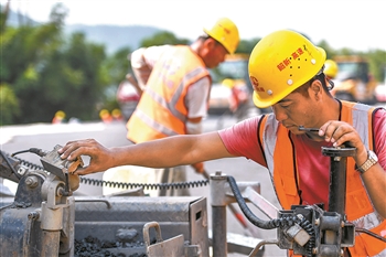 8月25日,在广东省韶关市翁源县官渡镇的韶新高速公路施工现场,中铁四局的建设者们冒着35摄氏度的高温施工。新华社记者 刘大伟 摄
