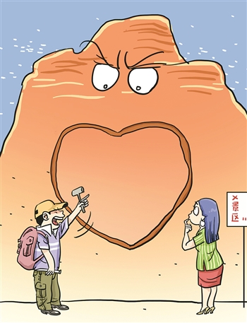 情侣刻字以求天长地久,能否实现不好说,如今却有遗臭万年的可能——据报道,有些区域的丹霞地貌比较酥脆,人工痕迹若要自然消失需几十年上百年,甚至有些损坏是不可逆的。一边是人人喊打、深恶痛绝,一边是频频发生、不以为然,这源于一些游客缺乏基本的文明素养和敬畏之心。同时也应反思,如何加强对游览类似自然景观的监督和管理。比如,加强现场的监控和秩序维护,把相关游客纳入不文明游客黑名单,等等。赵春青/图 嘉湖/文