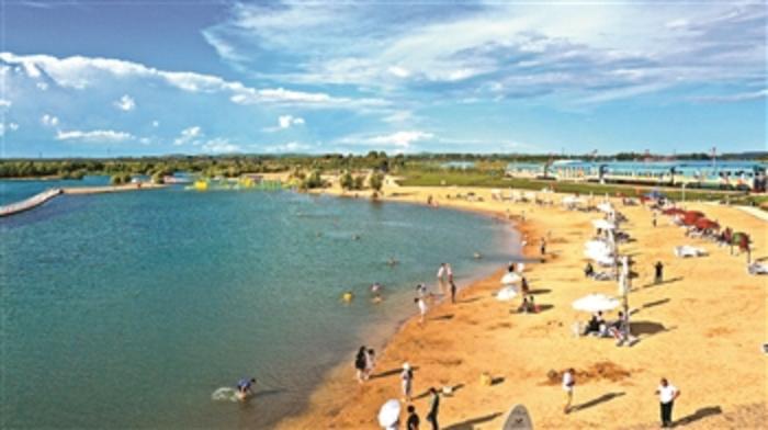 8月10日,游人在位于乌兰浩特市的神骏湾旅游度假区游玩。