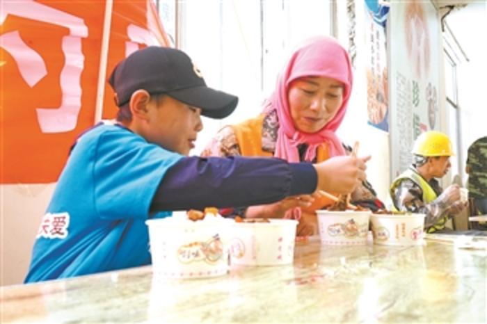 8月25日,在工地食堂,即将上小学五年级的马应鹏给妈妈夹菜。