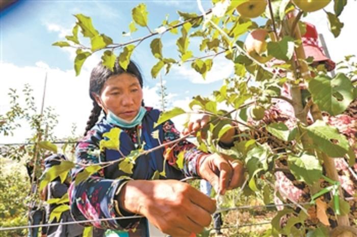 8月24日,西藏山南市森布日村经济果林,工人贡卓正在给苹果树拉枝。2019年12月,贡卓一家7口从平均海拔4800米的安多县搬迁至此,贡卓成为果园务工人员。经过企业种植培训后上岗,她每天可有160元收入。
