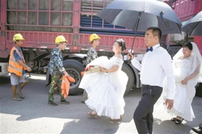 8月24日,建筑工夫妻走向拍摄地,遇见下班的工友。当日,湖南省长沙市岳麓区一处建筑工地上,七对工人夫妻免费拍摄婚纱照,迎接七夕节的到来。杨华峰 摄/视觉中国