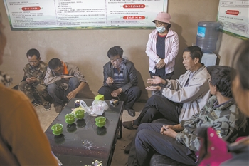 8月25日,甘肃省总工会派出的村第一书记、帮扶队长杨三虎(右三)同张志诚(右五)一起把几个养蜂小组的负责人召集起来商讨下一阶段蜂蜜销售和定价的问题。