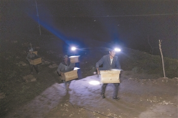 8月24日,回岔村合作社的100多箱蜜蜂受到其它蜂群入侵,村民们连夜将蜂箱转运到5公里外的蜂场。