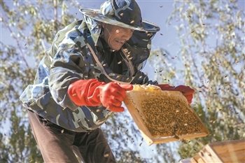 8月25日,56岁的张建堂正在收割蜂蜜。他在今年来到张志诚的蜂场学习养蜂,每月不仅能获得2400元的稳定收入,同时自己还养了63箱蜂。