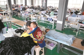 8月24日,云南省鲁甸县回族居民丁洪娟带着自己的两个孩子在扶贫车间工作。