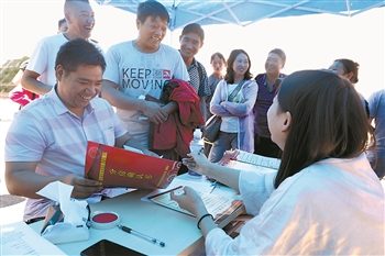 8月26日,马洪昌(左一)在卯家湾安置点现场签订《分房确认书》,随后领取新家钥匙。