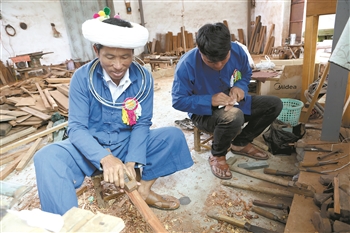 8月21日,云南省陇川县户撒阿昌族户早村,国家级第一批非物质文化遗产阿昌族户撒刀高级技师尹宝元和儿子一起制作刀鞘。户撒刀是我国三大民族刀具之一,分为实用菜刀等农具和工艺刀具,一把刀所需要的柄、鞘、银饰包装等,需要不同村寨的工匠们合作。这里,从事户撒刀经营的有180户,带动了当地约1500多名村民从事刀具配件生产工作。本报记者 吴凡 摄
