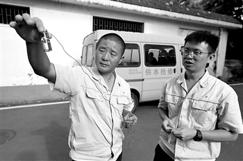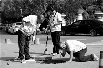 上图:当天,听漏队队员对一个小区雨水井里的水进行取样化验。