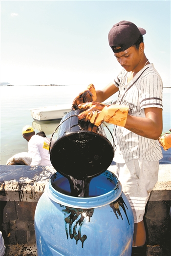 截至上周,救援人员已回收了900多吨油污、近600吨固体污染物和582立方米已吸饱油污的围油栏。