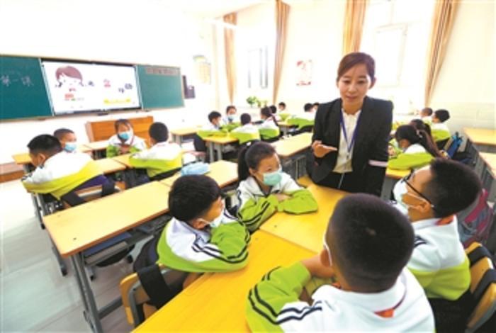 图为8月31日,科尔沁右翼前旗第二小学六年级三班学生和教师在开学第一课上讨论如何节约粮食。