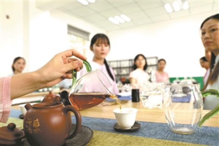 8月28日,湖北省襄阳市工会干部学校教室内,学员正在接受茶艺师就业技能培训。