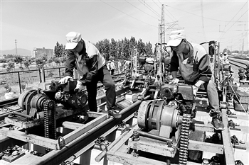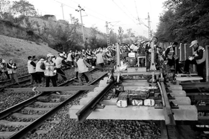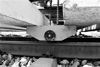 郑州局集团公司洛阳工务段车间主任滑发枝带领团队技术革新,将6对走行轮中间的一对改装制作机械动力走行装置,利用内燃发动机、链条连接带动走行轮的方法,实现了道岔纵向移动机械化(图②)。以前人工在线路上纵向推移一组长38米重70吨的预铺新道岔需要70人,采用新装置后,2人操作实现快速移动,提效数十倍(图③)。